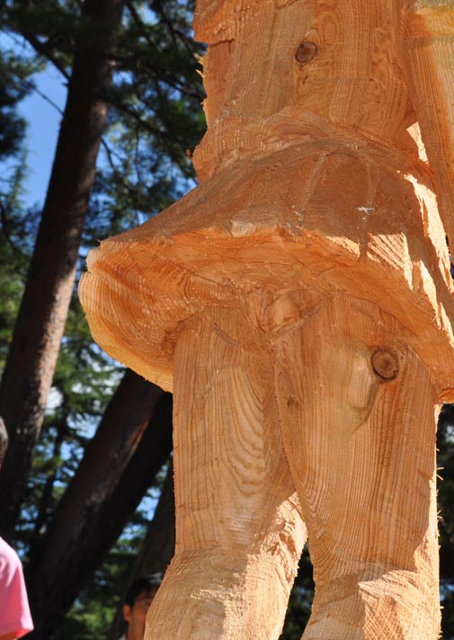 この段階でほぼ完成している状況。実際に最終日は仕上げだけの状態でした。「初日から参加している人達は丸太から製作している過程が見られてラッキーですね」という10時になって木崎湖キャンプ場の管理人さんのMCは的確でしたね。こりゃ最初から見たかったな…。