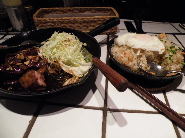 噂通り人気店で空いていたのが運良くカウンターの1人席だけだったのでアッサリと案内されたのは僥倖。名物であるトンテキ(200g、800円)とガーリックライスとビールを注文して堪能しました。