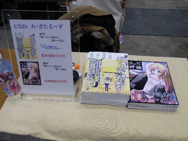 いよいよ会場となりましたが自分の居る島中はまったりペース。まあ初日は西館がメインですから当然とは思いましたが。それでもぽちぽちと来始めて本が売れていくのは素直に嬉しいものです。意外だったのは新刊もそうですが既刊もかなり売れていく事。後でアドバイスを貰いましたが新刊1冊だけではなかなか買い辛いから既刊もあればいいよと言われましたので納得。あとはこの島中でエロゲ関連の本を売っているのが私の所ともう1ヶ所しかないのも影響していたかなぁ・・・?